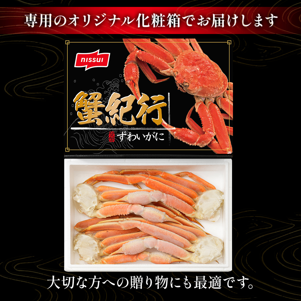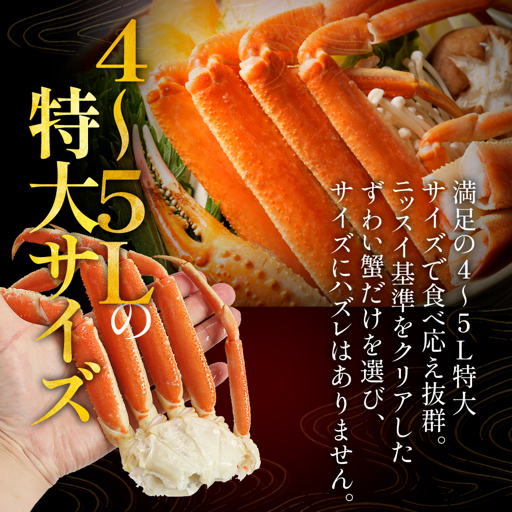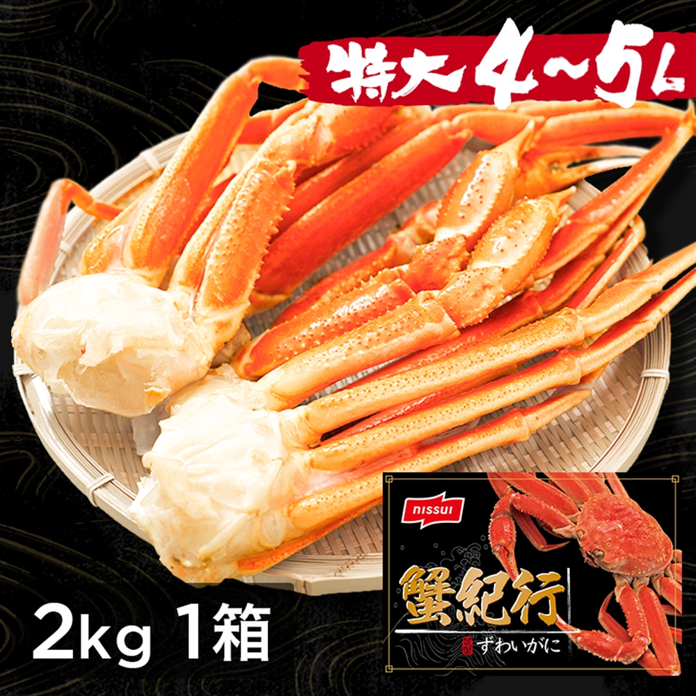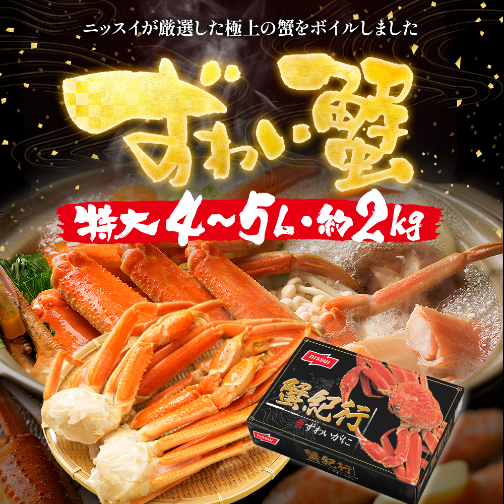 ニッスイが高い基準で厳選。自信をもってお届けする「ずわい蟹」特大4L、5Lサイズ、約2㎏。 ニッスイのカニは抜群の鮮度。漁獲してすぐ船の上で凍結させる、鮮度抜群の船上凍結品のみを採用。だから鮮度に自信があります。自信を持って届けられる蟹だけど選りすぐり。 ニッスイ通販のカニは、4L、5Lの特大サイズ!満足のサイズで食べ応え抜群。大満足の身入り!ニッスイが厳しい基準で厳選したズワイガニは、満足の身入りで食べ応え抜群。 ニッスイ通販のお歳暮カニは、絶妙な塩加減。採れたてをすぐに凍結した新鮮なずわいがにをプロが絶妙な塩加減でボイルし急速冷凍。解凍するだけで、おいしい。 お客様の元に安心安全なカニをお届けするために経験豊富な多くのニッスイのプロが出荷まで関わっています。 特大ずわいがに。圧倒的なサイズ感4L~5Lのずわいがに脚肩。 お歳暮やお年賀などの贈答用としてもおすすめです。 カニ雑炊、カニグラタンにもおすすめの冷凍ズワイガニ 冷凍ズワイガニの食べ方。カニの食べ方。