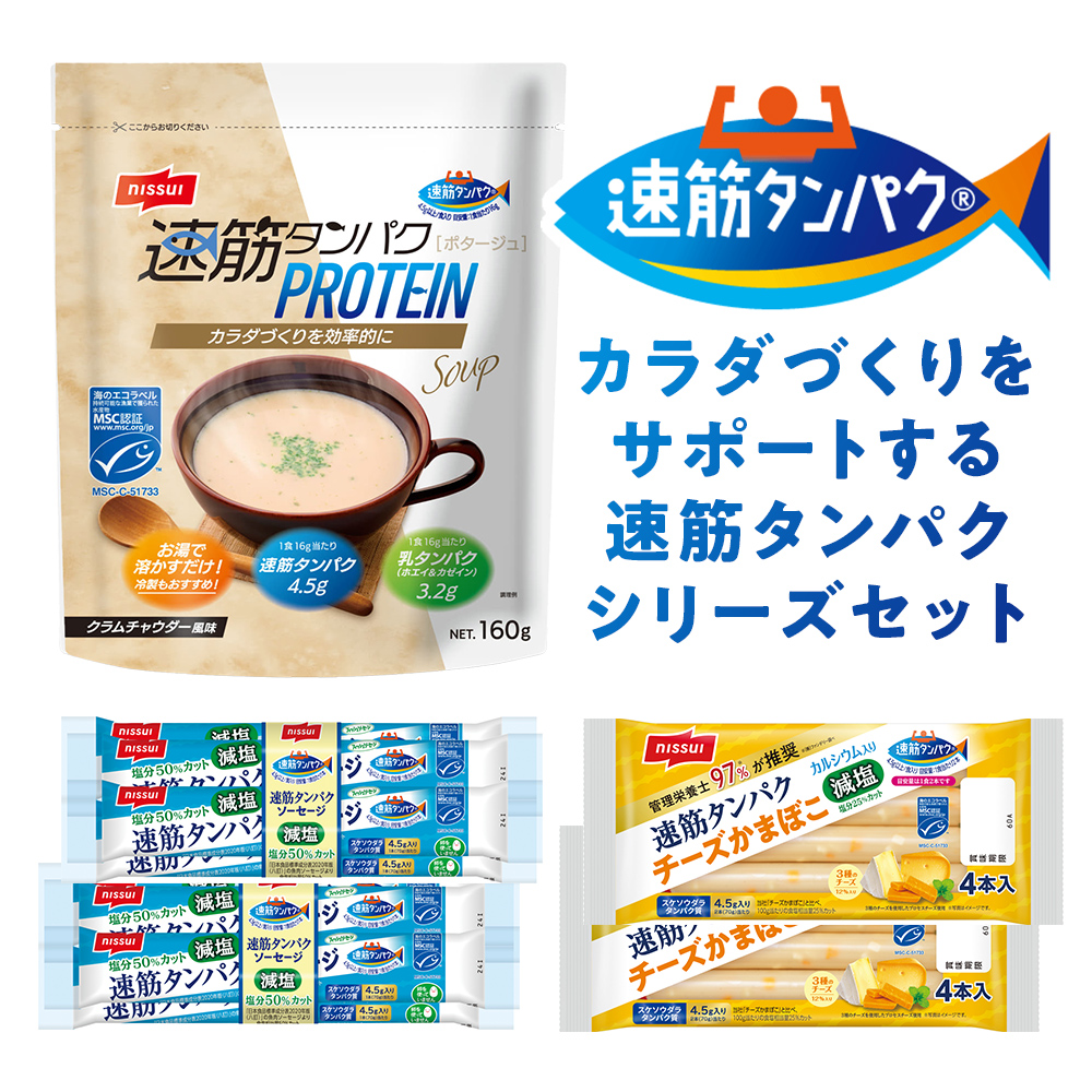 【速筋タンパクプロテインスープ クラムチャウダー風味】 乳成分・鶏肉 【速筋タンパクソーセージ減塩MSC】 かに・小麦・大豆 【速筋タンパクチーズかまぼこ減塩MSC】 かに・小麦・乳成分 食品表示法で表示が定められている28品目のうち、商品に含まれる物質を示しています。