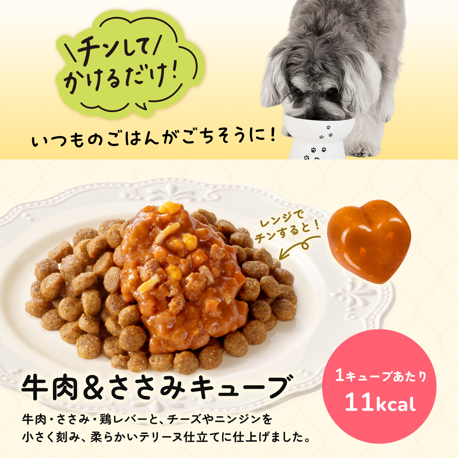 肉類(鶏ささみ、牛モモ肉、鶏レバー、鶏レバーパウダー)、ニンジン、じゃがいも、プロセスチーズ、増粘安定剤(トウモロコシ由来加工澱粉、ゼラチン)、着色料(カラメル、カロテノイド)、牛脂、殺菌乳酸菌乾燥粉末