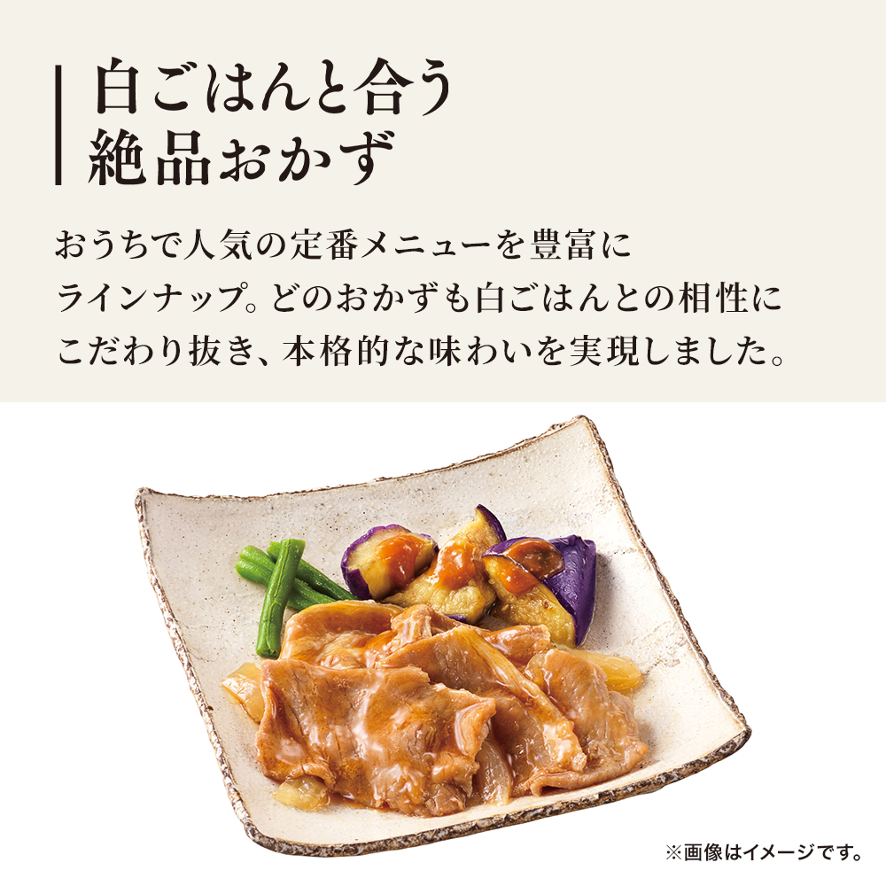 米(国産)、野菜(たまねぎ、いんげん)、豚肉、揚げなす、しょうゆ、砂糖、みそ、はっ酵調味料、還元水あめ、おろししょうが、植物油脂、醸造酢、ゼラチン、香辛料、加工油脂、食塩、たん白加水分解物、ポークエキス、酵母エキス、チキンコンソメ、ぶどう糖、オニオンエキス、全粉乳、卵白、えびエキス/増粘剤(加工でん粉、増粘多糖類)、加工でん粉、調味料(アミノ酸等)、炭酸水素Na、カラメル色素、(一部にえび・小麦・卵・乳成分・大豆・鶏肉・豚肉・ゼラチンを含む)