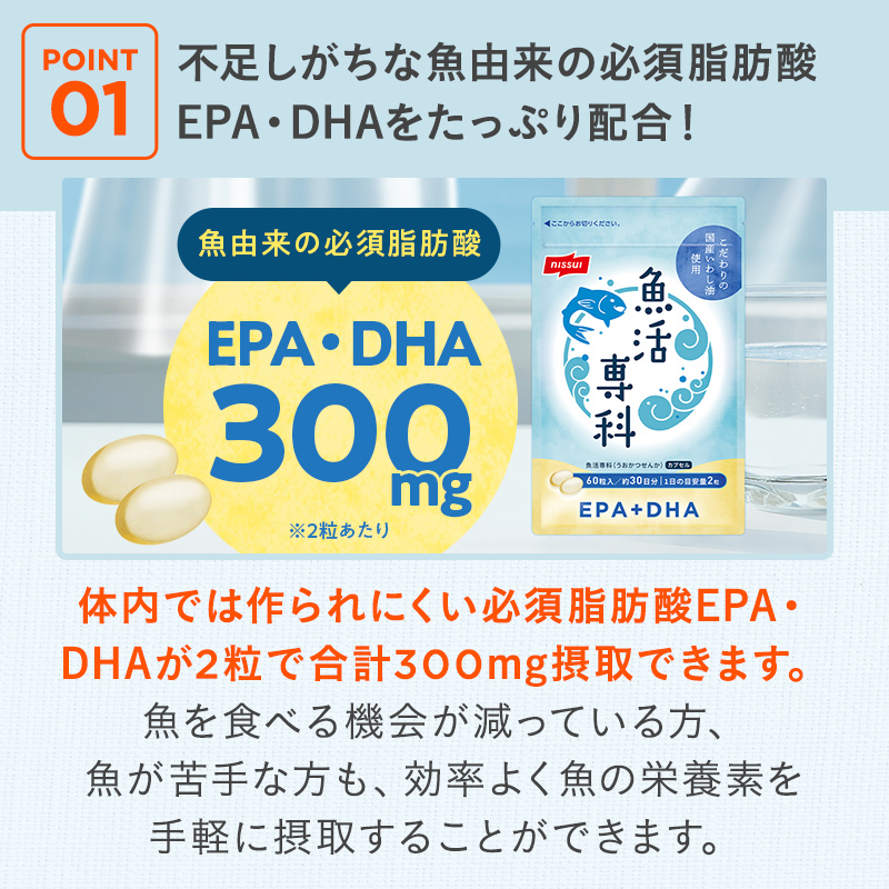 - POINT 01 不足しがちな魚由来の必須脂肪酸EPA・DHAをたっぷり300mg配合!