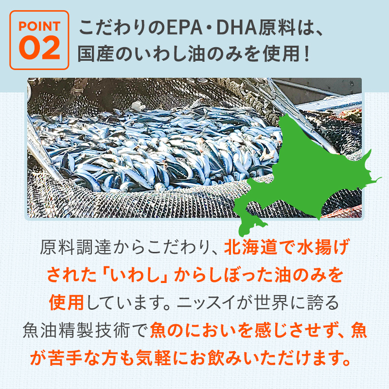 ※参考:JPHC研究 Circulation,2006;113,195-202. - POINT 02 こだわりのEPA・DHA原料は、国産いわし油のみを使用!