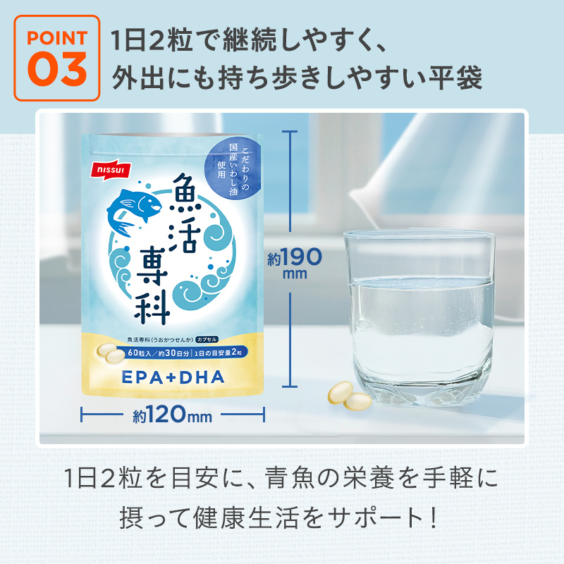 「魚活専科カプセル」は、1日目安量たったの2粒。毎日手軽に青魚の栄養を摂ることができます。 かさばらない平袋のため、仕事や旅行など外出先にも持ち歩けて便利!