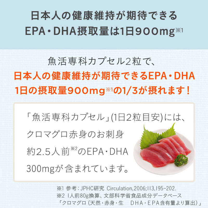 そこで、「魚活専科カプセル」には、不足しがちなEPA・DHAを2粒あたり合計300mg配合。2粒で、日本人の健康維持に必要とされるEPA・DHAの1日摂取目安量(約900mg※)の3分の1を手軽に摂ることができます。