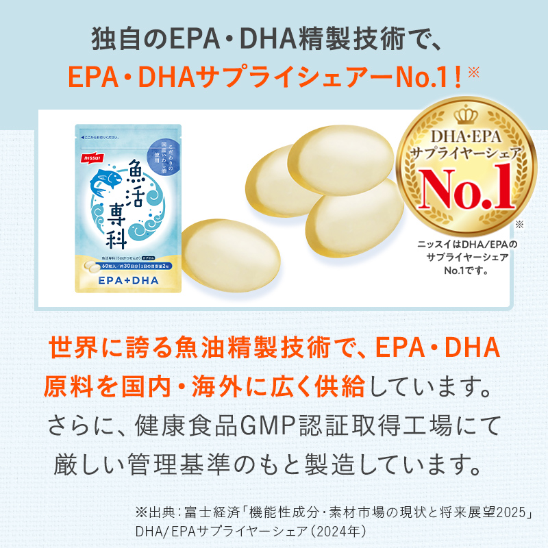 ニッスイのEPA・DHA原料は、世界に誇る魚油精製技術で国内・海外に広く供給しており、EPA・DHAサプライシェアーNo.1※!