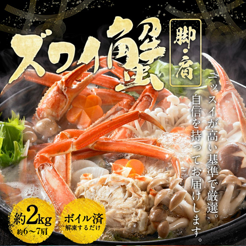 ニッスイが高い基準で厳選。自信をもってお届けするズワイ蟹脚・肩約2㎏(約6~7肩)。ボイル済み、解凍するだけ。 厳しい審査を通過したものだけを厳選した極上のズワイ蟹。専用の化粧箱に丁寧に梱包してお届けいたしますのでお歳暮や冬のギフトにも最適です。 美味しい厳選ずわいがに 厳しいチェックを通過したズワイ蟹のみを使用。絶対の自信をもってお届け。それがニッスイのカニブランドを実現しています。 ボイル済みで身入りたっぷりのズワイ蟹を解凍してすぐお召しあがりいただけます。蟹の味がしっかり活きた自慢のズワイ蟹です。 カニレシピ。ほっと温まる蟹鍋 カニレシピ。香ばしい香りがたまらない焼き蟹