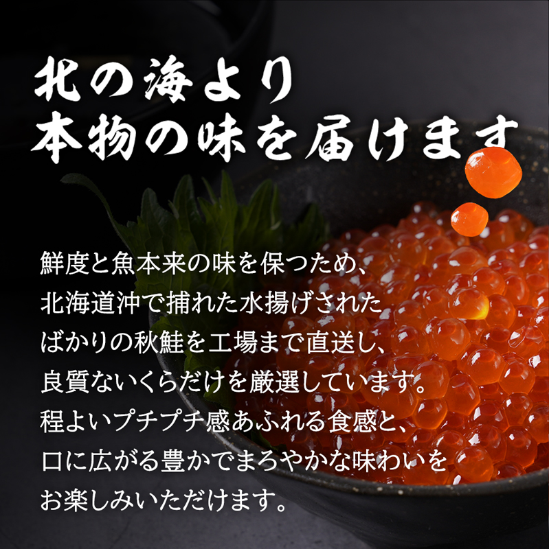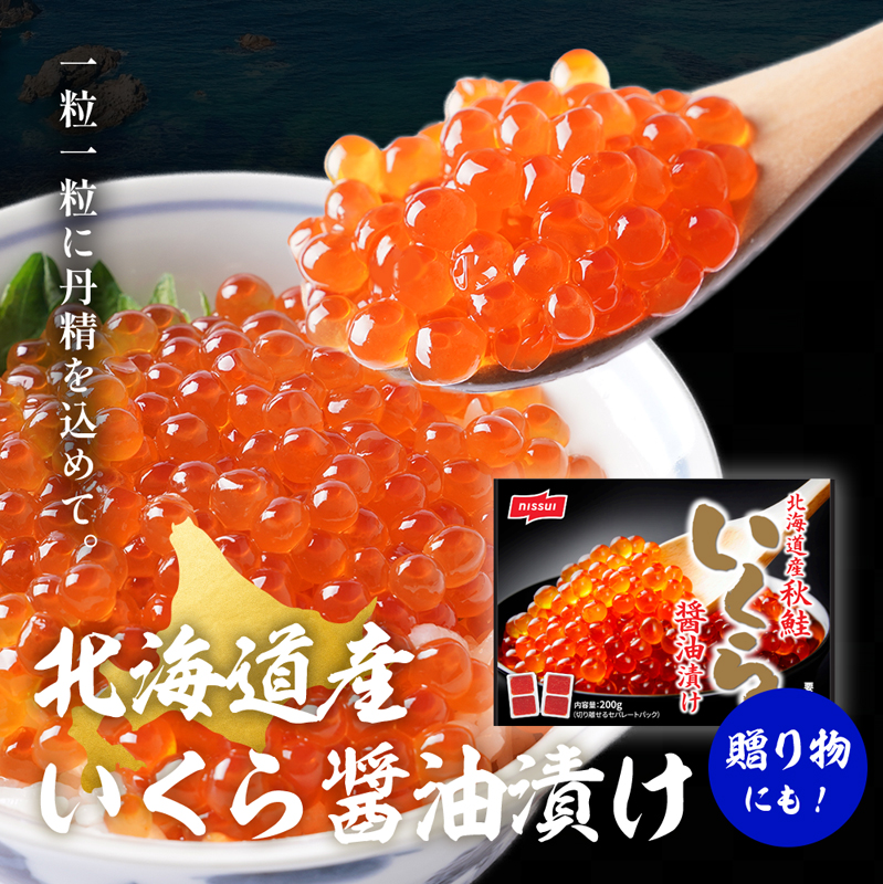 - 鮭卵(北海道)、しょうゆ、清酒、還元水あめ、たん白加水分解物、こんぶエキス、みりん、こんぶだし、はっ酵調味料/調味料(アミノ酸等)、(一部に小麦・いくら・大豆を含む)
