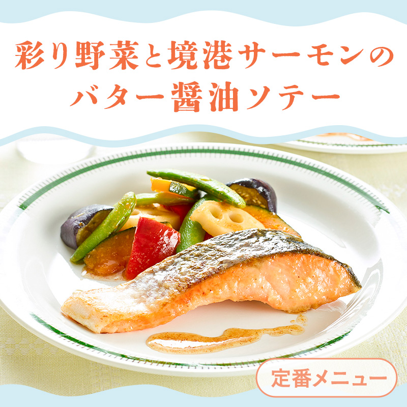 - 定番MENU. 「彩り野菜と境港サーモンのバター醤油ソテー」