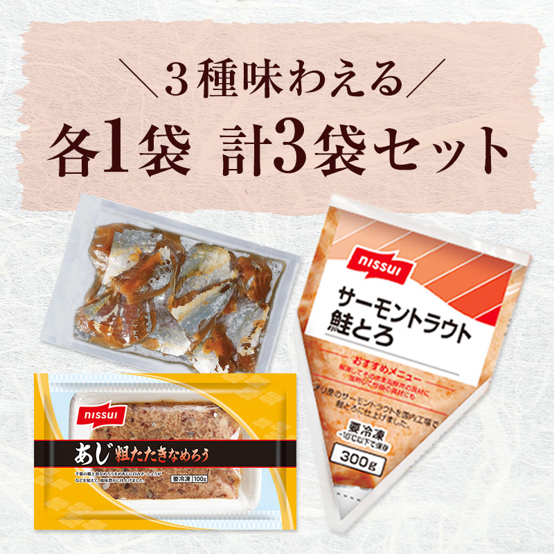 「サーモントラウト鮭とろ・あじ醤油漬け・あじたたきなめろう」